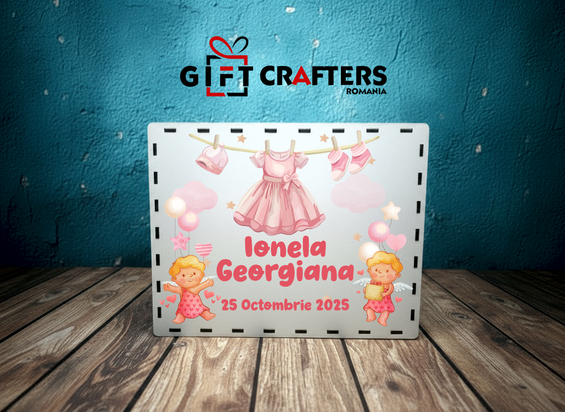 Transformă momentul botezului într-o amintire de neuitat cu această cutie elegantă pentru dar! Realizată din MDF de 3 mm grosime și imprimată UV pentru culori vii și durabile, cutia este personalizată cu numele fetiței și data evenimentului. Designul delicat, în nuanțe pastelate, o face perfectă pentru o mică prințesă.
